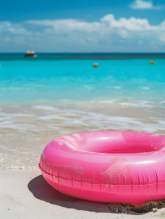 A pink inflatable ring drifts over turquoise water as white foam churns around, capturing a sunny summer moment that evokes fun, relaxation, and carefree vacation vibes. Generated A.I.
