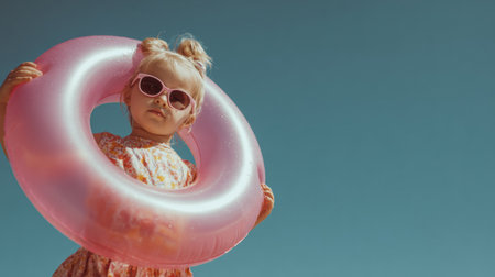 Playful summer portrait of a kid with pink sunglasses holding an inflatable swim ring against a clear blue sky, retro-inspired vacation mood