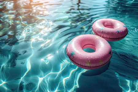 Inflatable pink ring and two white rings on a vibrant blue background, perfect for summer themed projects. Ai generated image