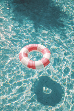 Colorful inflatable ring floating in a calm swimming pool, with sunlit reflections and a serene summer vibe.