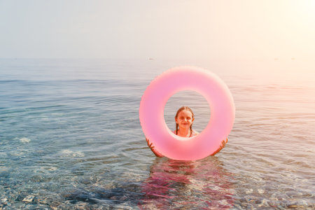 Child sea inflatable holding a pink ring while standing in the clear ocean water during a happy summer vacation