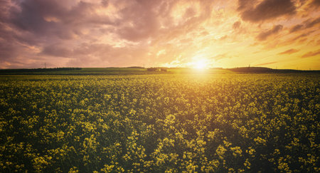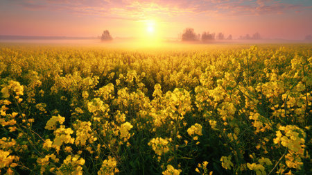 Sunrise lights up blooming rapeseed fields with bright yellow flowers and fresh dew, set against a misty horizon, marking the arrival of spring.