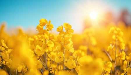 A stunning view of vibrant yellow flowers basking in sunlight, creating a cheerful atmosphere against a clear blue sky, perfect for nature lovers.