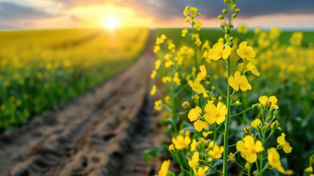 Yellow bright flowers in a bloom in a field of rapeseed at sunset light, creating a beautiful summer landscape. Agricultural business concept image. Vintage film aesthetic.