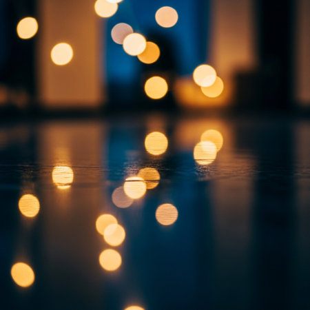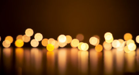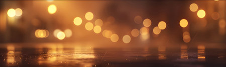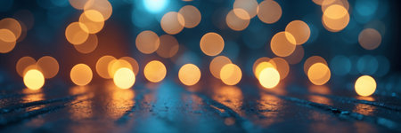A mesmerizing display of bokeh lights reflecting on a wet pavement during the night. The warm golden hues create a tranquil, dreamy ambiance perfect for artistic projects.