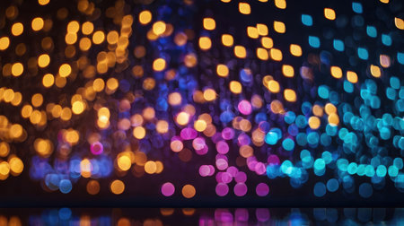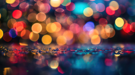 A captivating display of colorful bokeh lights, creating a festive and abstract background with beautiful reflections on a dark, glossy surface.
