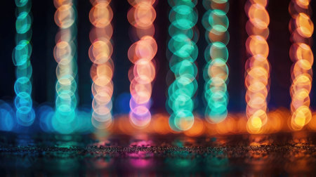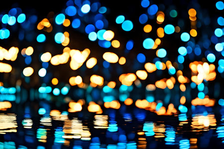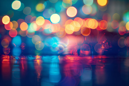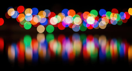 A mesmerizing display of vibrant, out-of-focus lights reflecting on a dark, still surface, creating a beautiful bokeh effect and a sense of festive ambiance.