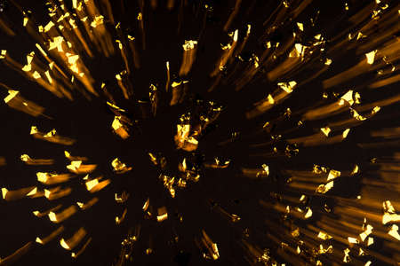 Abstract blurred golden colorful rays moving opposite each other with colorful bokeh. Graphic illustration. Festive, holiday gift card background.
