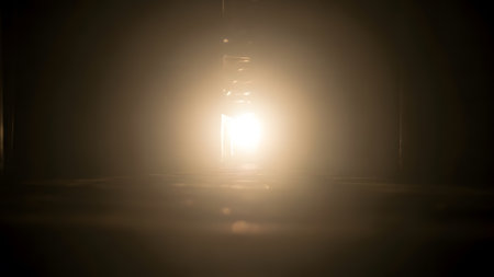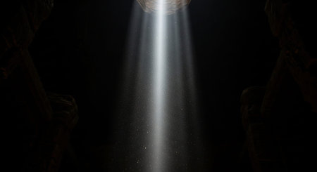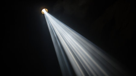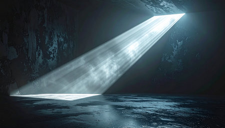A mesmerizing light beam pierces through an expansive dark space, creating an ethereal atmosphere. The interplay of shadows and glow evokes mystery and tranquility.
