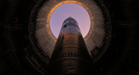 Intercontinental ballistic missile icbm standing vertically inside a dark, deep concrete launch silo, viewed from a low angle. The imposing weapon points towards the sky, highlighting strategic power and military readiness.