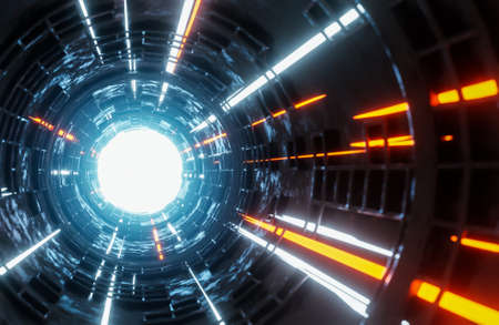 Moving light beams in sci-fi tunnel.,digital background.,3d model and illustration.