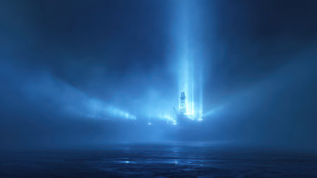 A bright blue light beam shines upwards through a hazy, atmospheric environment, creating a sense of mystery and focus.