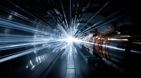 Bright streams of light burst from a high-tech apparatus in a laboratory setting, highlighting advanced scientific equipment and a dynamic atmosphere of innovation