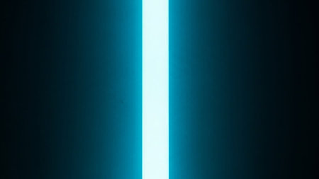 An abstract composition a dark, heavily textured wall illuminated by a single, bright cyan neon light bar running horizontally across its center. The rough, uneven surface of the wall absorbs and reflects the vibrant, electric glow of the light, creating a dramatic contrast between light and shadow. This modern and atmospheric evokes a sense of contemporary and