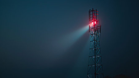A signal tower with a spotlight effect, highlighting its height and structure.