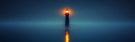 A serene evening scene features a lighthouse standing tall against a dark sky at dusk. The glowing light reflects beautifully on calm waters, creating a peaceful atmosphere.