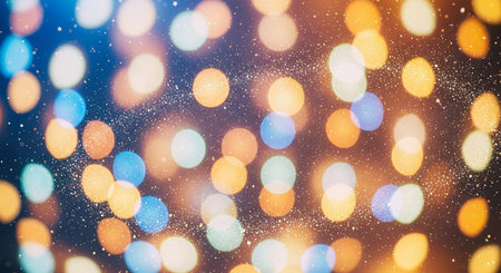 A beautiful abstract background featuring soft, out of focus circular lights in warm golden, white, and blue tones. This creates a magical and festive bokeh effect.