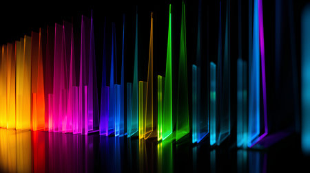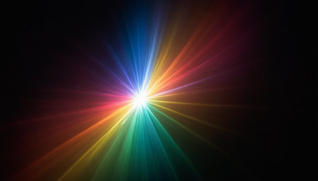 abstract background with rainbow-colored light refractions and glowing prism effects on dark backdrop.