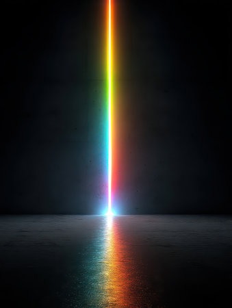 A vibrant light beam emits a spectrum of rainbow colors in a dark environment, creating a striking reflection on a smooth surface, evoking a sense of mystery and beauty.