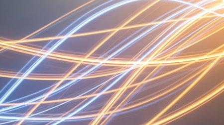 This image features a dynamic composition of light trails in warm and cool tones. The lines intersect and overlap, creating a sense of movement and energy. The soft gradient background enhances the fluidity of the light paths.