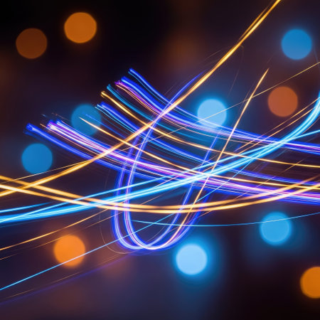 Dynamic light trails weave across a dark backdrop, creating an abstract display. The composition features streaks of blue, orange, and purple light, producing a sense of movement. Soft bokeh circles add depth to the visual. Suitable for technology, design, or visual interest applications.
