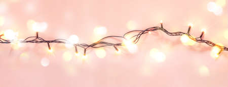 Copper string light in woman hands. Christmas mood and atmosphere. Blurred photos, bokeh.