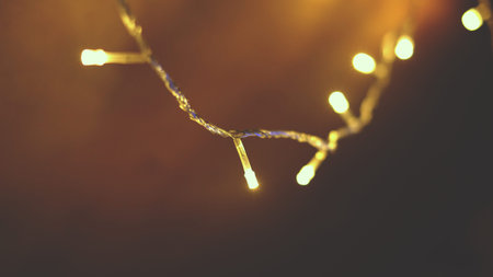 Background - electric garland with incandescent bulbs, yellow warm light, retro style, star filter, atmospheric close-up