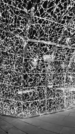 An amazing street decoration lights on the streets of Genoa in the winter with an artistic background and some people enjoying the moment