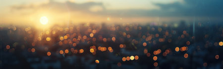 A panoramic view of a city at sunset, with the sun shining brightly in the distance and casting a golden glow over the cityscape. The city is out of focus, creating a dreamy and ethereal atmosphere. The light from the city creates a scattering of warm, yellow, and orange bokeh dots, adding to the romantic and nostalgic feeling of the image.