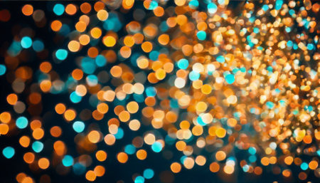 This image captures a mesmerizing bokeh effect with vibrant blue and warm golden lights scattered across a dark background, ideal for backdrop use.. AI Generation