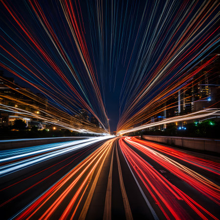 Captivating long exposure photograph capturing vibrant light trails of traffic on an urban highway at night, showcasing movement and energy in city life.