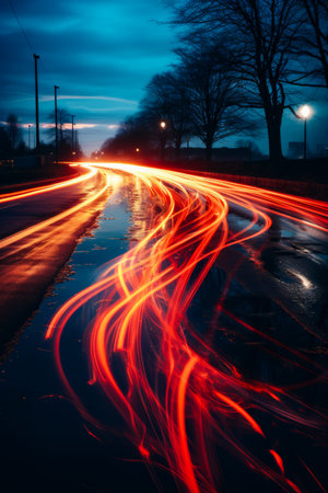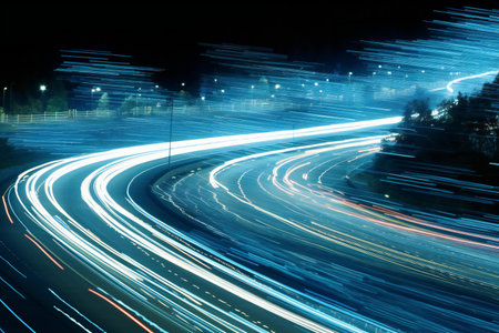 Streams of vibrant light carve through the twilight, capturing the relentless flow of data and energy. On a wet coastal road, abstract swirls and high-speed trails create a visual metaphor for innovation, progress, and the dynamic pulse of modern technology.