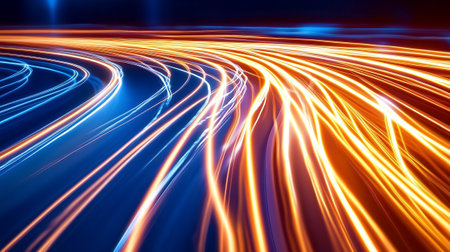 This abstract image showcases dynamic light trails that convey a sense of speed and motion against a dark backdrop, making it ideal for technology and energy projects.