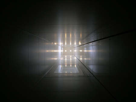 Grid with holes allowing the passage of red light in to a hollow metal tube causing shapes and patterns