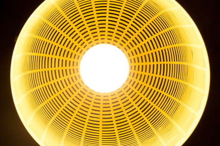 Glowing yellow bulb with bright helix incide on diagonal line between black empty wall and blue stripes with flecks. Horizontal with copy space. Electricity. Dark.