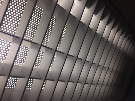 Fluorescent lamps on the whitewashed ceiling of the office space. A light lamp on the ceiling. Room classic interior. modern design.