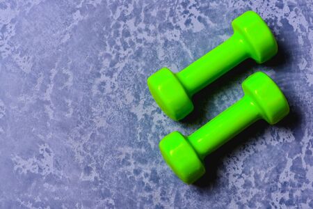 Shaping and fitness equipment. Sports and healthy lifestyle concept. Barbells in light weight, copy space. Dumbbells made of bright green plastic on grey texture background, top view