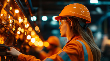 A woman in industrial setting wearing safety helmet and uniform, focused on her work with glowing lights in background, showcasing dedication and professionalism