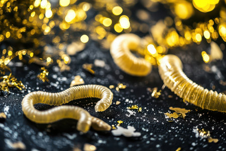 Golden colored worms rest on a dark sparkly surface surrounded by festive confetti creating a magical party atmosphere.