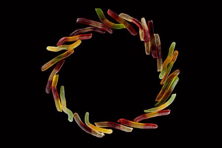 top view of round frame made of colorful gummy worms isolated on black, Halloween treat