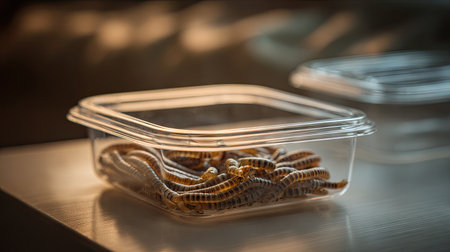 A clear plastic container filled with live mealworms rests on a wooden surface, illuminated by warm natural light, highlighting the insects' texture.