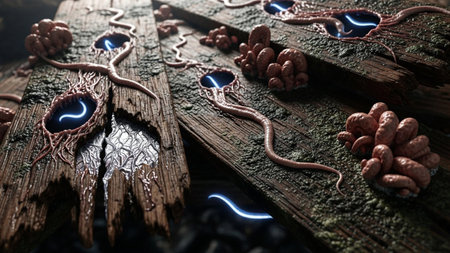 A close-up, macro view reveals an unsettling organic growth emerging from weathered, dark wooden planks. Pinkish, root-like tendrils intertwine and sprout bulbous, fungal-like clusters. Within irregular openings in the wood, a vibrant, electric blue light emanates, creating a stark contrast with the muted, earthy tones of the wood and organic matter. The scene evokes a sense of alien life or a mysterious natural phenomenon, with intricate details and a dark, atmospheric mood.