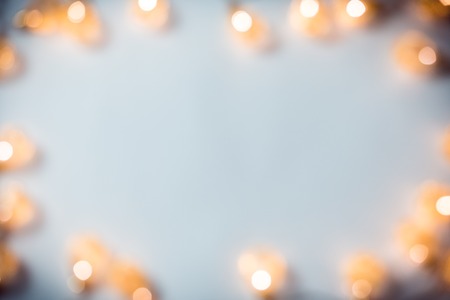 Christmas blurred background with a glowing garland golden bokeh on white. A beautiful holiday idea for postcards and posters. Free space, frame