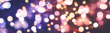 Blurred lights abstract background, banner texture. Christmas holiday defocused bokeh header. Wide screen wallpaper. Panoramic web banner with copy space for design