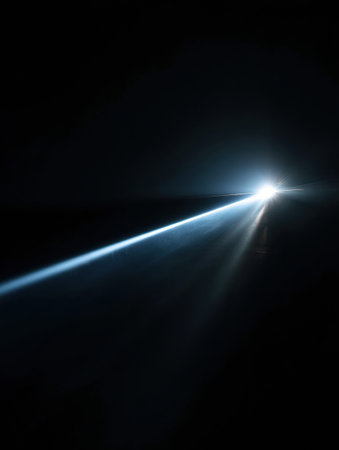 Intense light beam shining on a dark black backdrop, close-up view