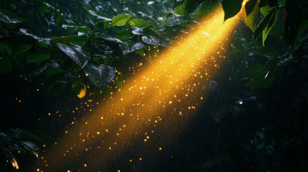 Stunning golden rays of light shine through a dark background, creating an ethereal and magical atmosphere. Perfect for artistic projects and designs.