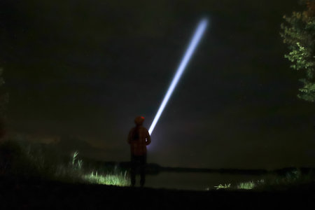 A man with his back turned and projecting a flashlight into the night sky. On both sides are trees and grassland, The sky is full of stars, AI Generated.