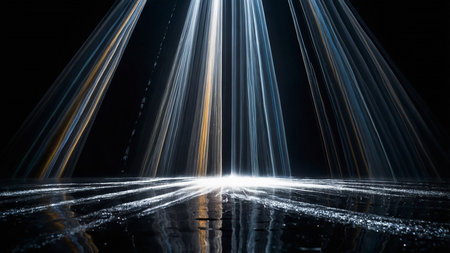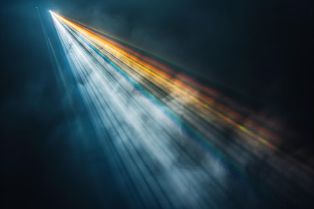 This image captures sharp, converging light beams emerging from darkness, creating a mesmerizing linear effect. It signifies creativity, enlightenment, modern art, and the interplay between light and shadow. AI generated image