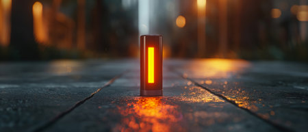Garland lights in a glass jar like a light bulb on the street at night with a blurry background.
