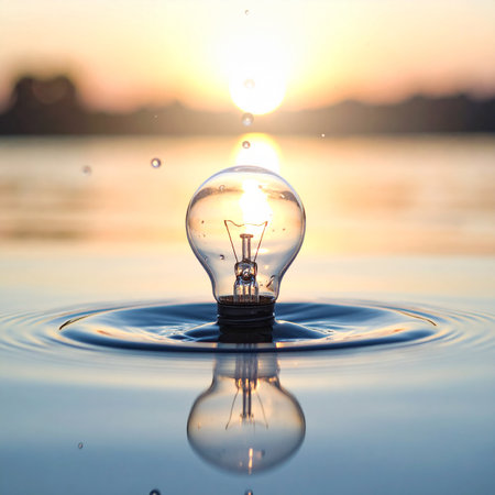 An incandescent light bulb floats on rippling water with a sunset in the background.